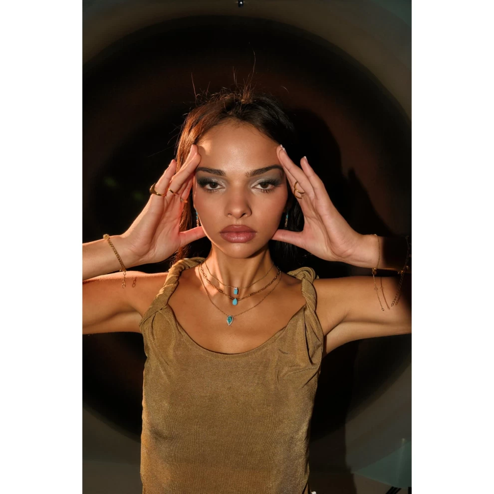نحاس مطلي بذهب عيار 18 ثقيل، المقاس: 44 سم + امتداد 6 سم، حجر فيروزي فارسي طبيعي، مصقول يدويًا