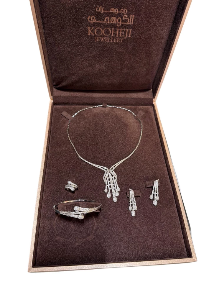 طقم ألماس من دار الكوهجي، قلادة، أقراط، سوار وخاتم من الذهب الأبيض عيار ١٨ قيراطًا. خيار مثالي لحفلات الزفاف، واحتفالات الذكرى السنوية، والهدايا التذكارية.