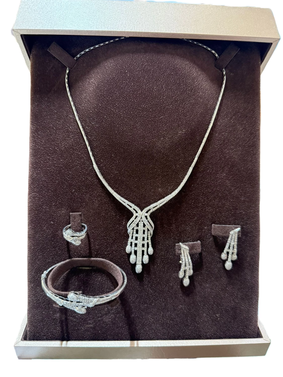 طقم ألماس من هاوس أوف كوهيجي، قلادة وأقراط وسوار وخاتم من الذهب الأبيض عيار 18 قيراطًا