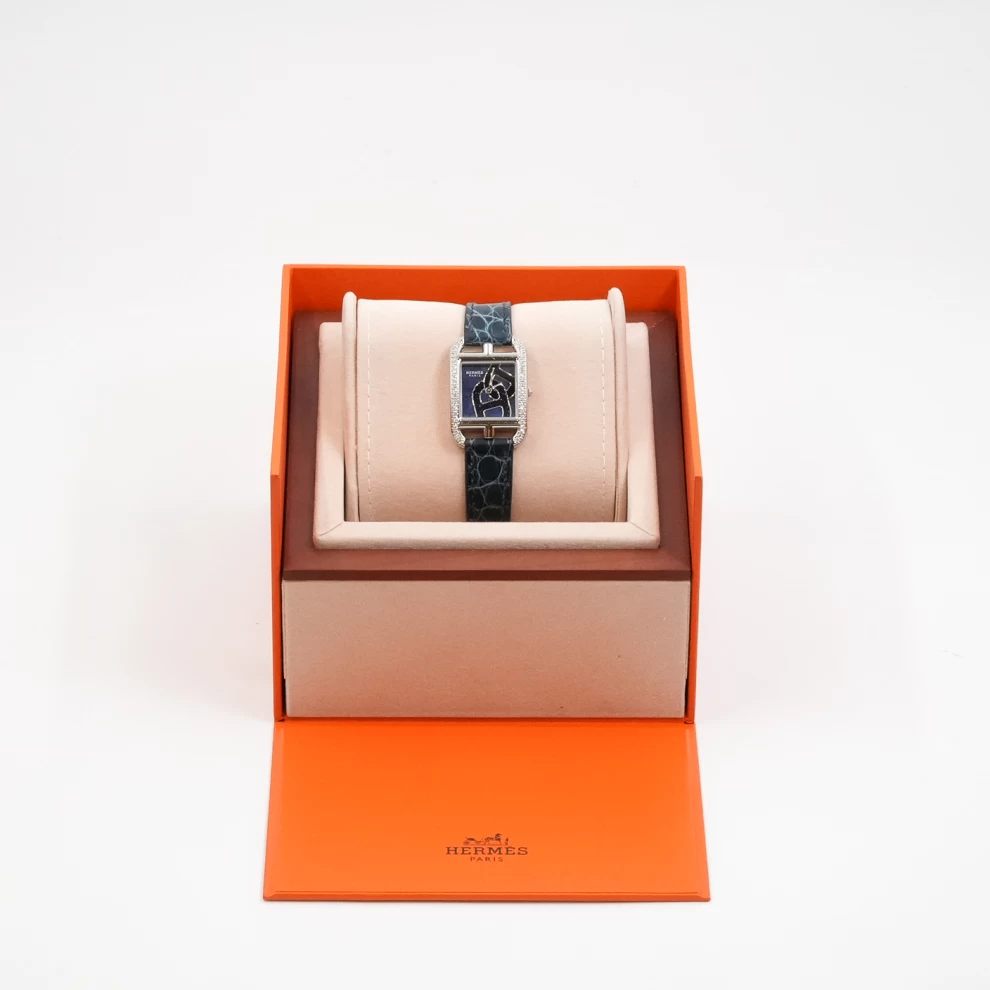ساعة هيرميس نانتوكيت (Hermès Nantucket) فاخرة تتميز بإطار من الفولاذ المرصع بالألماس، وميناء بنفسجي بزخرفة "سلسلة المرساة"، مع حزام من جلد التمساح باللون البنفسجي.