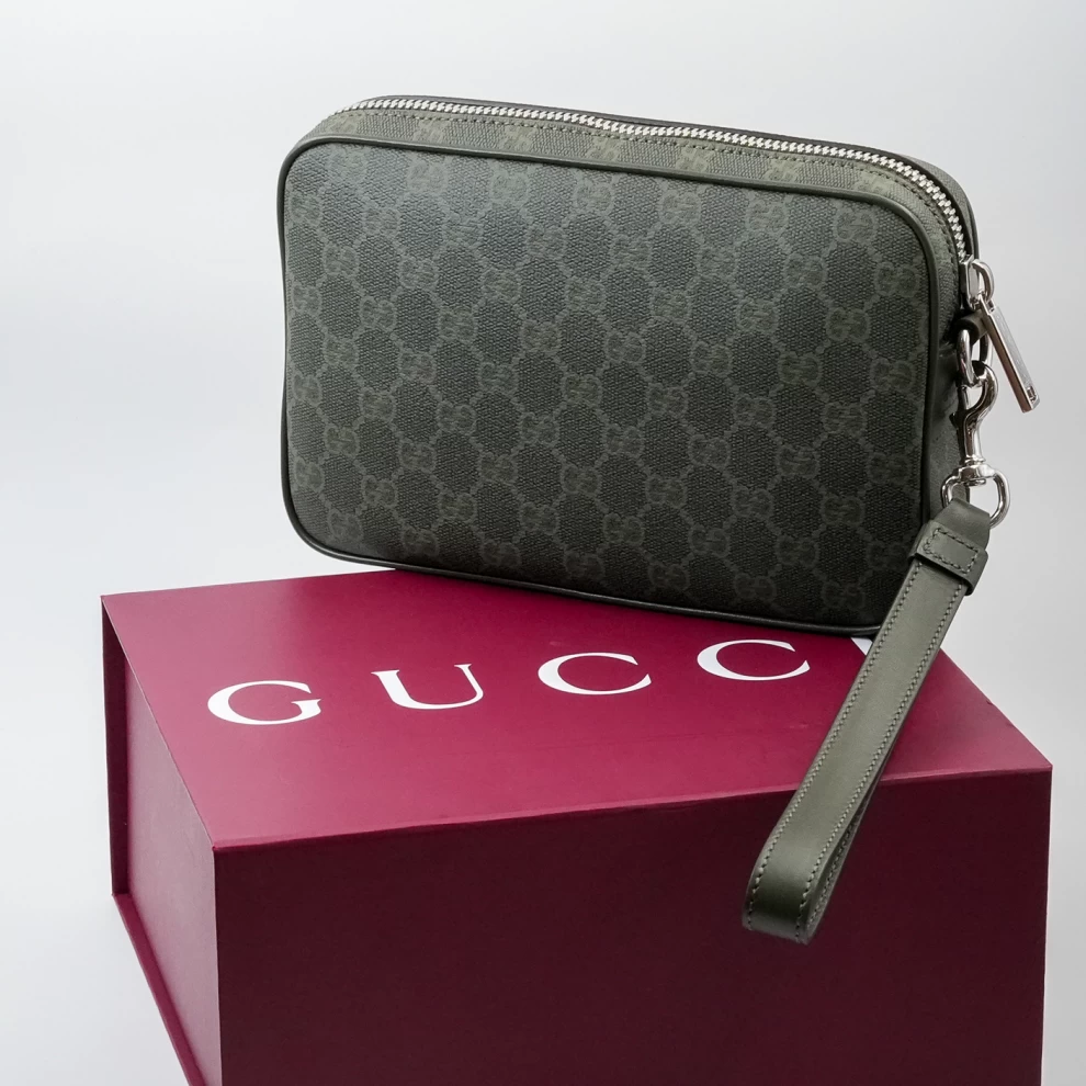 طقم "غوتشي" 2025 باللون الزيتي الفاخر وقماش الـ GG Supreme، يضم حقيبة يد ومحفظة وحامل بطاقات بتصميم عصري وأنيق.
