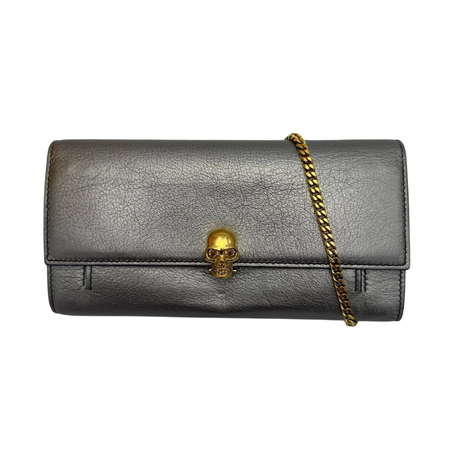 Silver-tone leather skull chain wallet from Alexander McQueen featuring a foldover top with snap closure, an interior zipped compartment, multiple interior card slots and an optional chain strap.