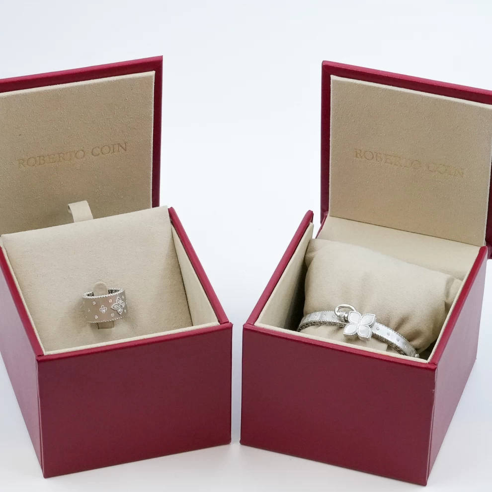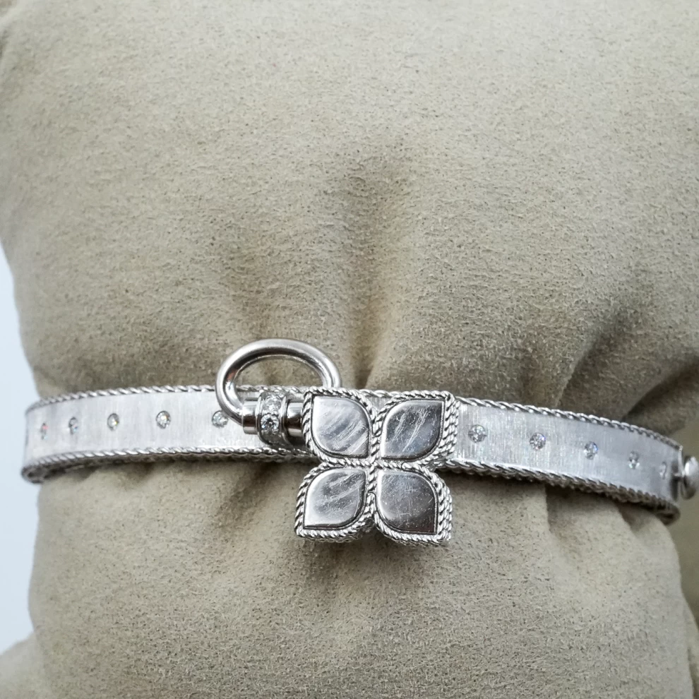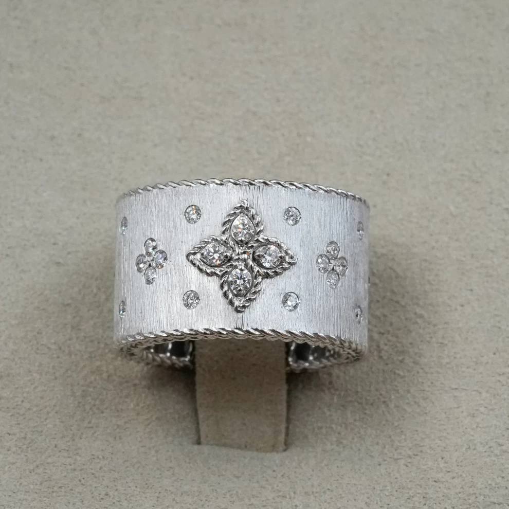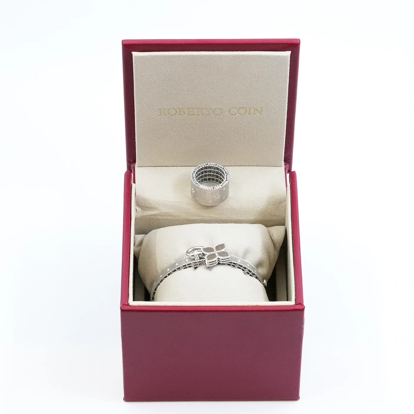 Embrace Italian elegance with this Roberto Coin Venetian Princess set. Handcrafted in 18kt white gold with a refined satin finish, this pairing includes a bold wide ring and a matching bangle, both accented by shimmering pavé diamonds. The collection’s iconic four-petal floral motif is inspired by Venetian legends, concealing a secret twisted-wire structure within. Complete with Roberto Coin’s signature hidden ruby, this set offers a blend of mystery and modern luxury for the discerning woman.