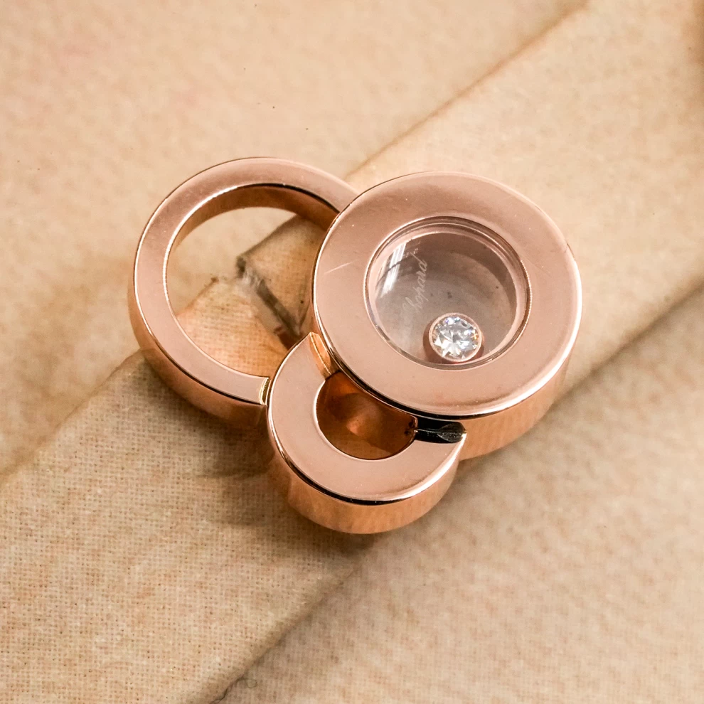 Inspired by the ethereal beauty of clouds, the Chopard Happy Dreams Earrings are a poetic expression of freedom and light. Crafted in polished 18k rose gold, these stud earrings feature a unique silhouette of interlocking circles that mimic a dreamy, celestial form. At their center, a single floating diamond dances freely between two sapphire crystals, creating a mesmerizing sparkle that captures the essence of Chopard’s playful luxury and sophisticated charm.
