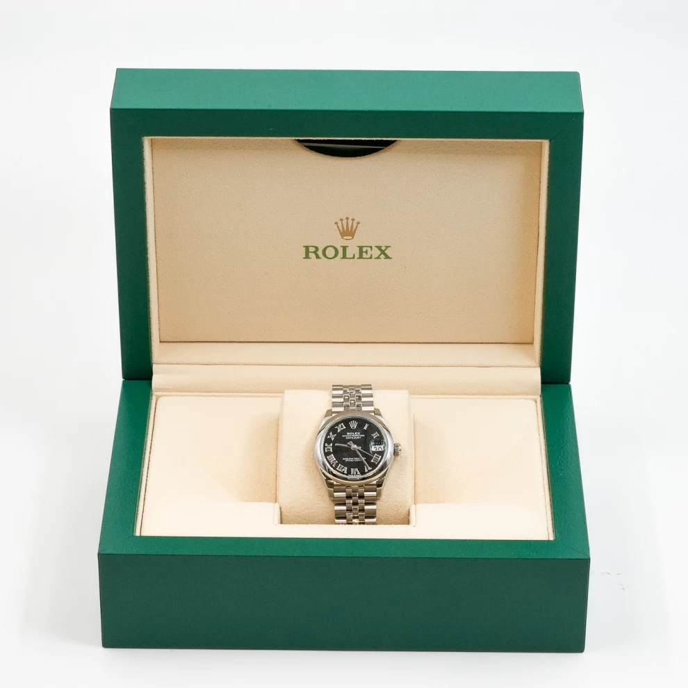 A classic stainless steel Rolex Datejust featuring a black dial with silver Roman numerals, a smooth bezel, and an elegant five-link Jubilee bracelet. Size 31