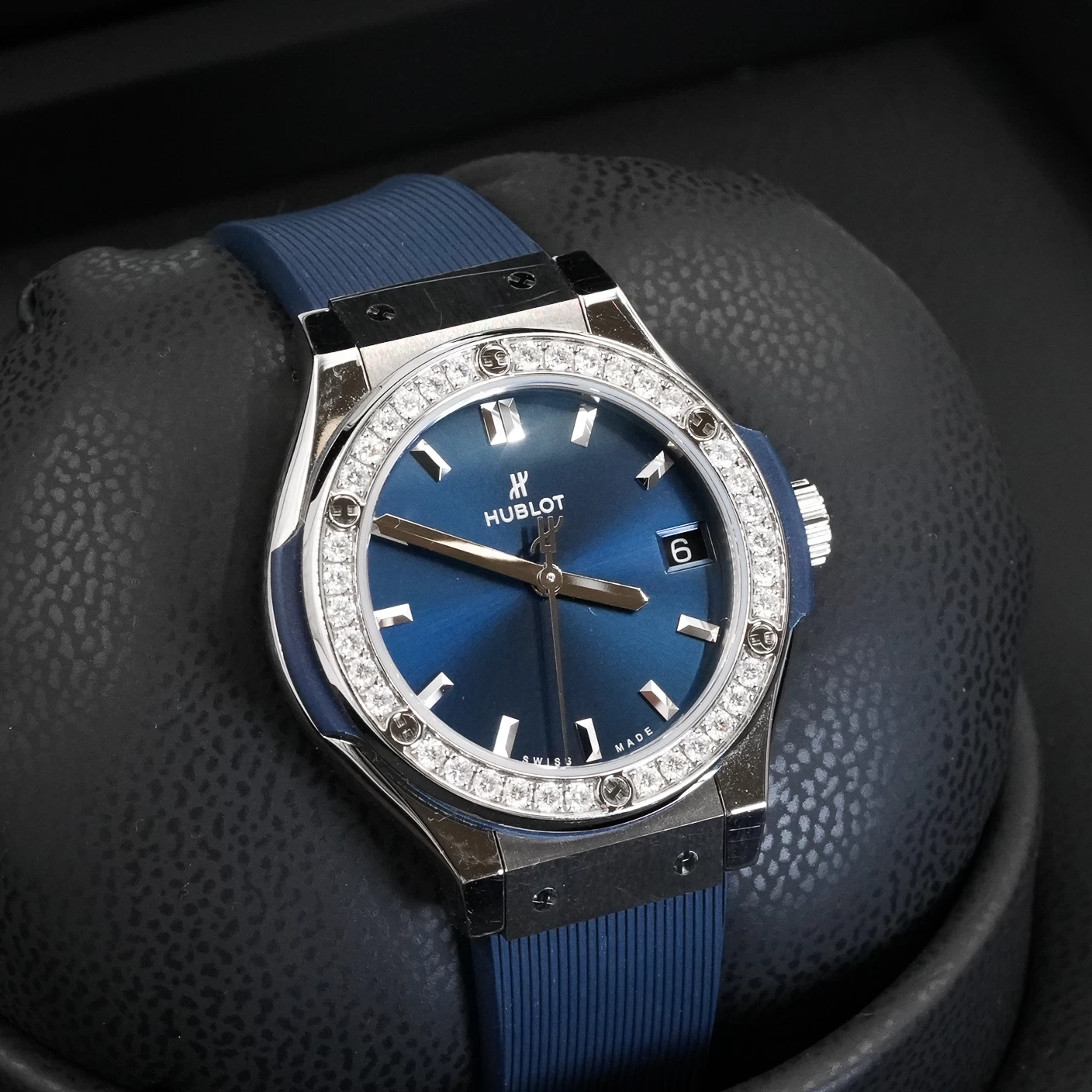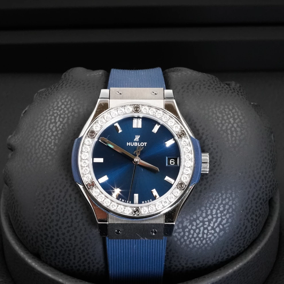 The 2025 Hublot Classic Fusion features a sunray blue dial and diamond-set titanium bezel, blending contemporary luxury with a sleek blue rubber strap.