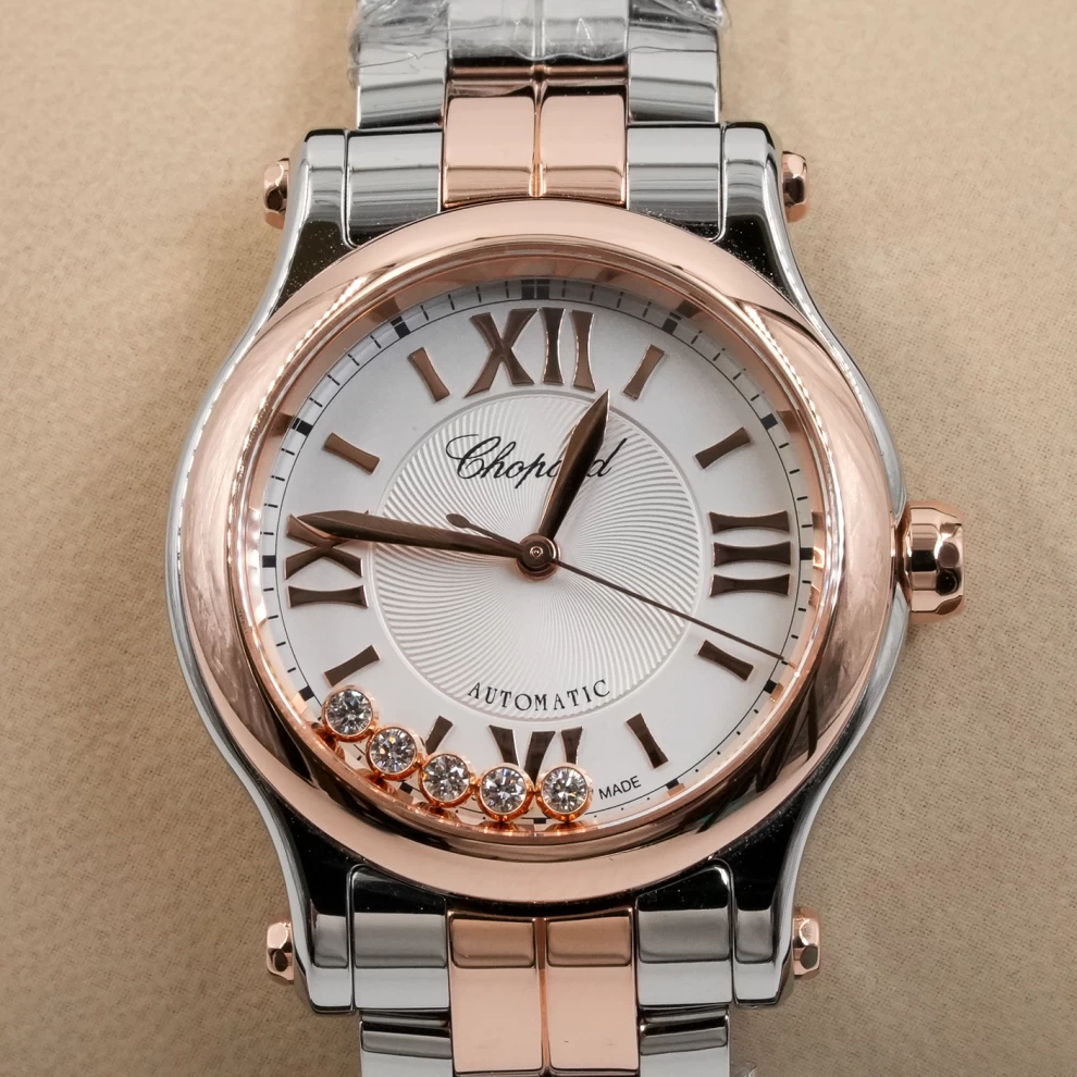 The 2025 Chopard Happy Sport watch in rose gold and Lucent Steel, featuring a silver dial with iconic dancing diamonds for a blend of playful elegance.