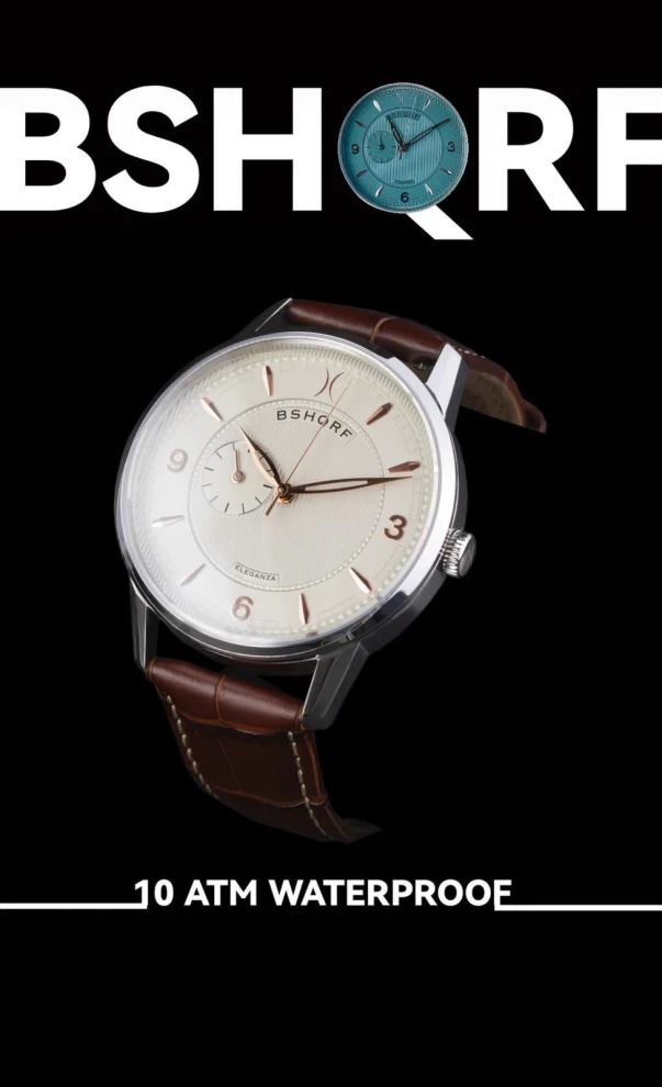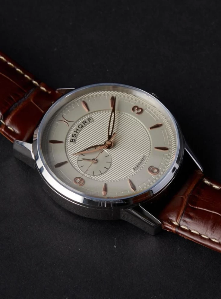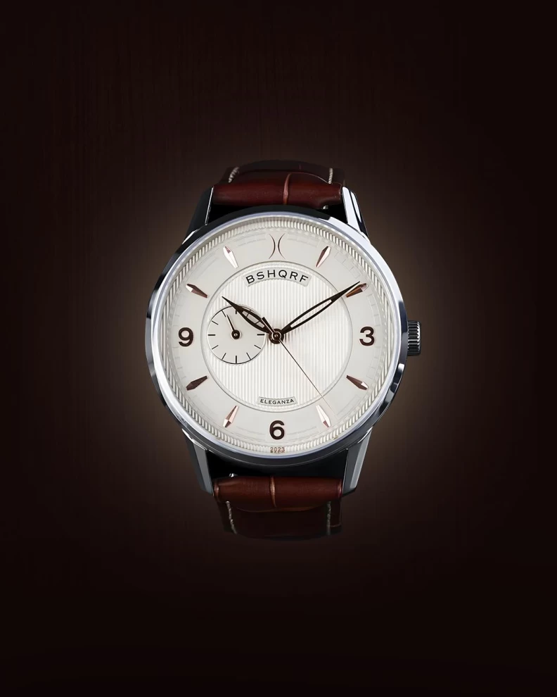 The beige dial of the Eleganza blends warmth with sophistication. Housed in 316L stainless steel and finished with dome-shaped sapphire crystal, every curve and cut reflects refined craftsmanship and enduring design.