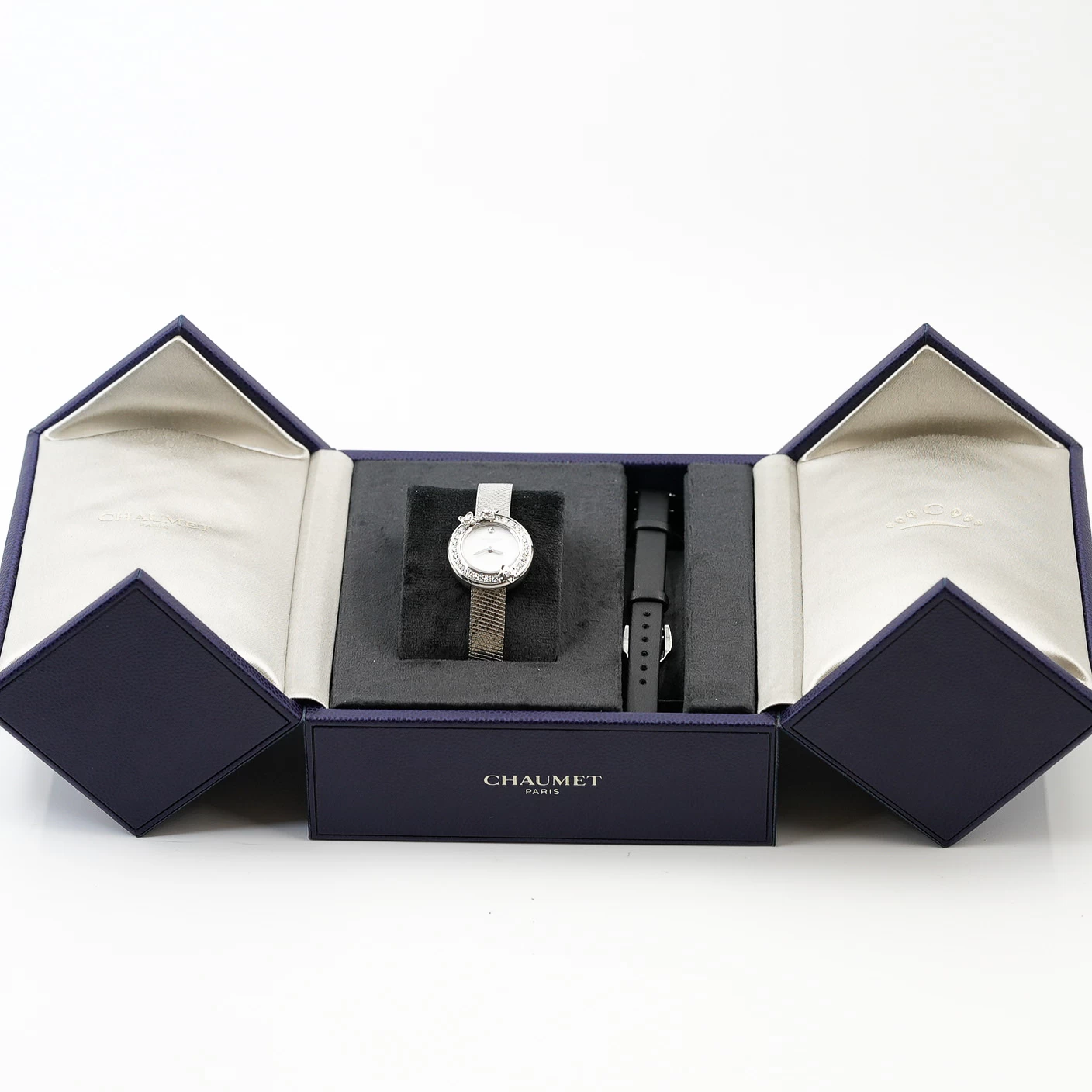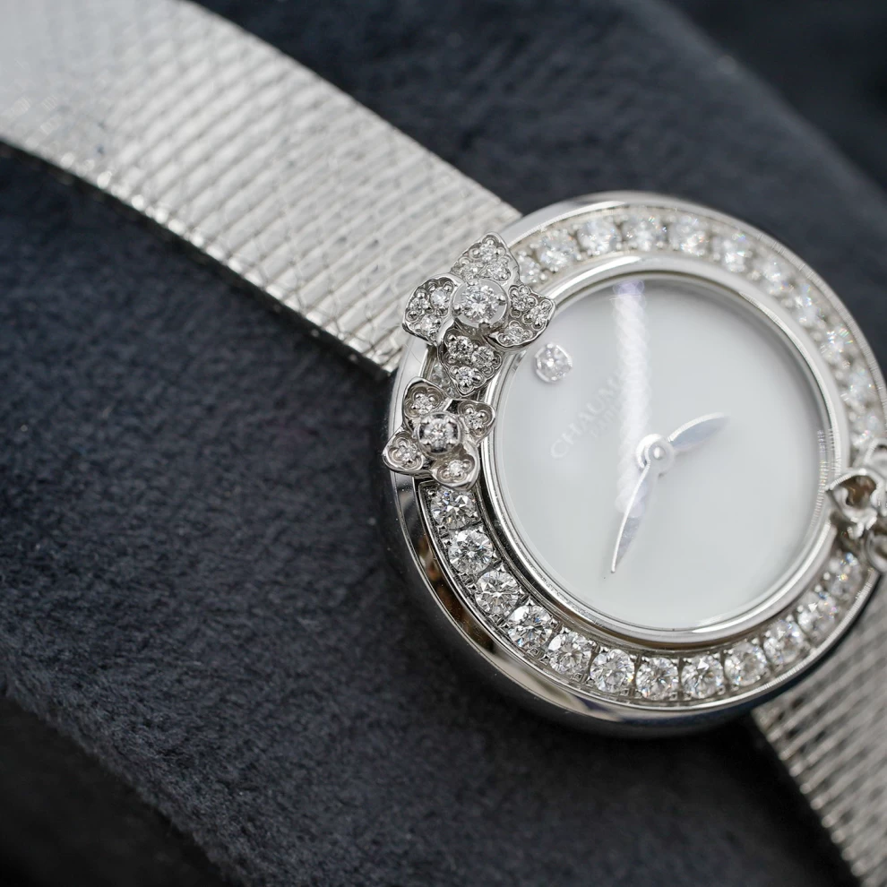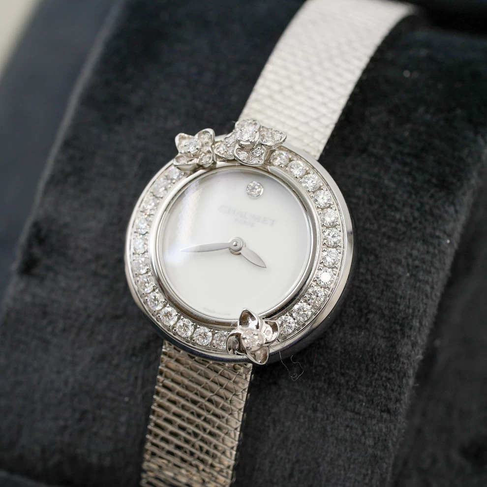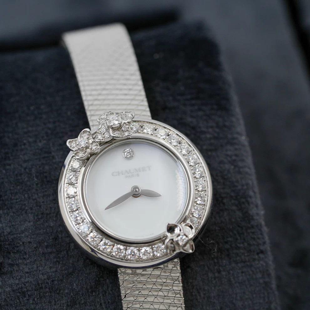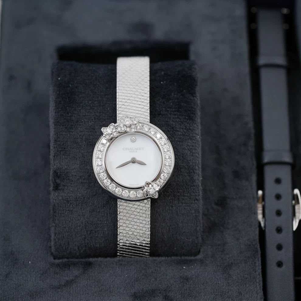 The Chaumet Hortensia is a poetic expression of fine jewelry and horology. This delicate timepiece features a stainless steel case adorned with a bezel of brilliant-cut diamonds and sculpted hydrangea flower motifs. The minimalist white lacquer dial is elegantly clean, complemented by a shimmering mesh steel bracelet (with an additional black leather strap included). Inspired by Empress Joséphine’s love of nature, this watch is a romantic and sophisticated accessory for any occasion.