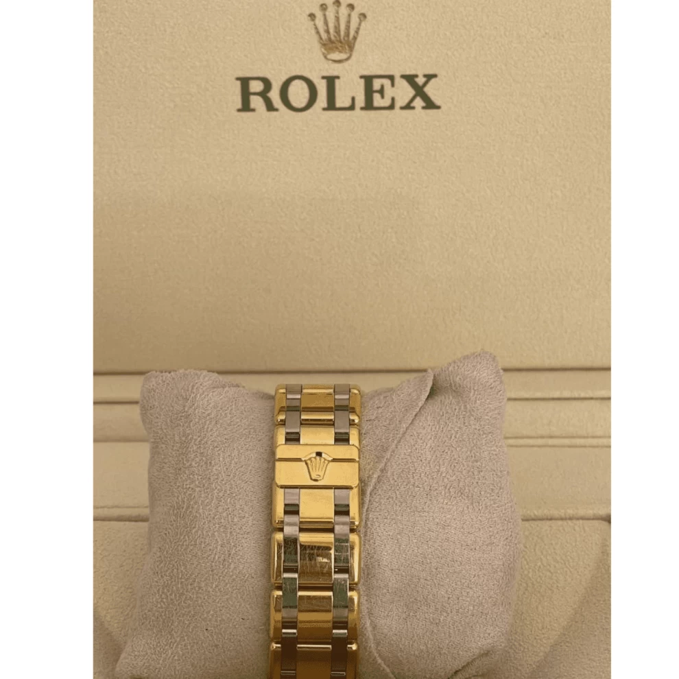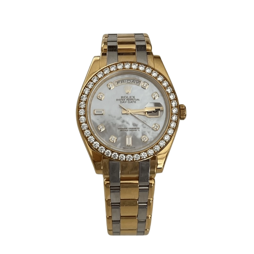 Pearl dial accented by diamond hour markers and a dazzling diamond-set bezel. The twotone Oyster bracelet and distinctive day-and-date windows epitomize luxury, making it a