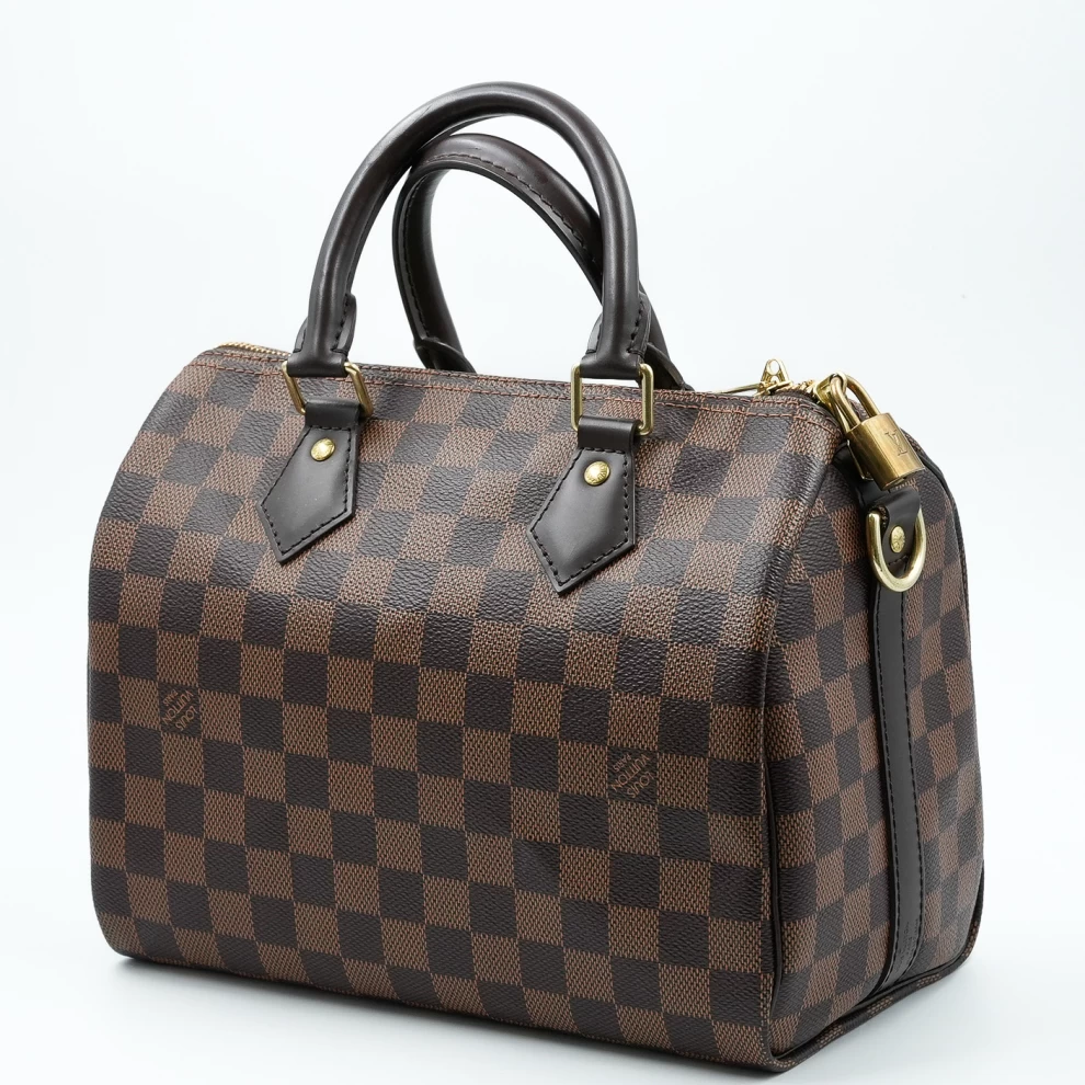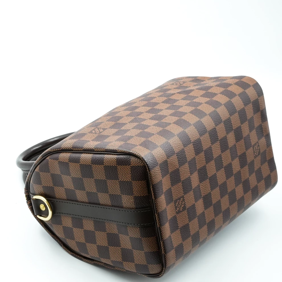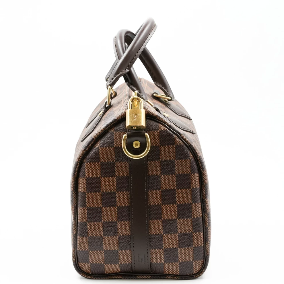 This bag is in the classic Damier Ebène coated canvas. A timeless icon of the house, this doctor-style handbag features the signature checkered pattern in shades of brown, complemented by smooth chocolate-colored leather trim and dual rolled top handles.