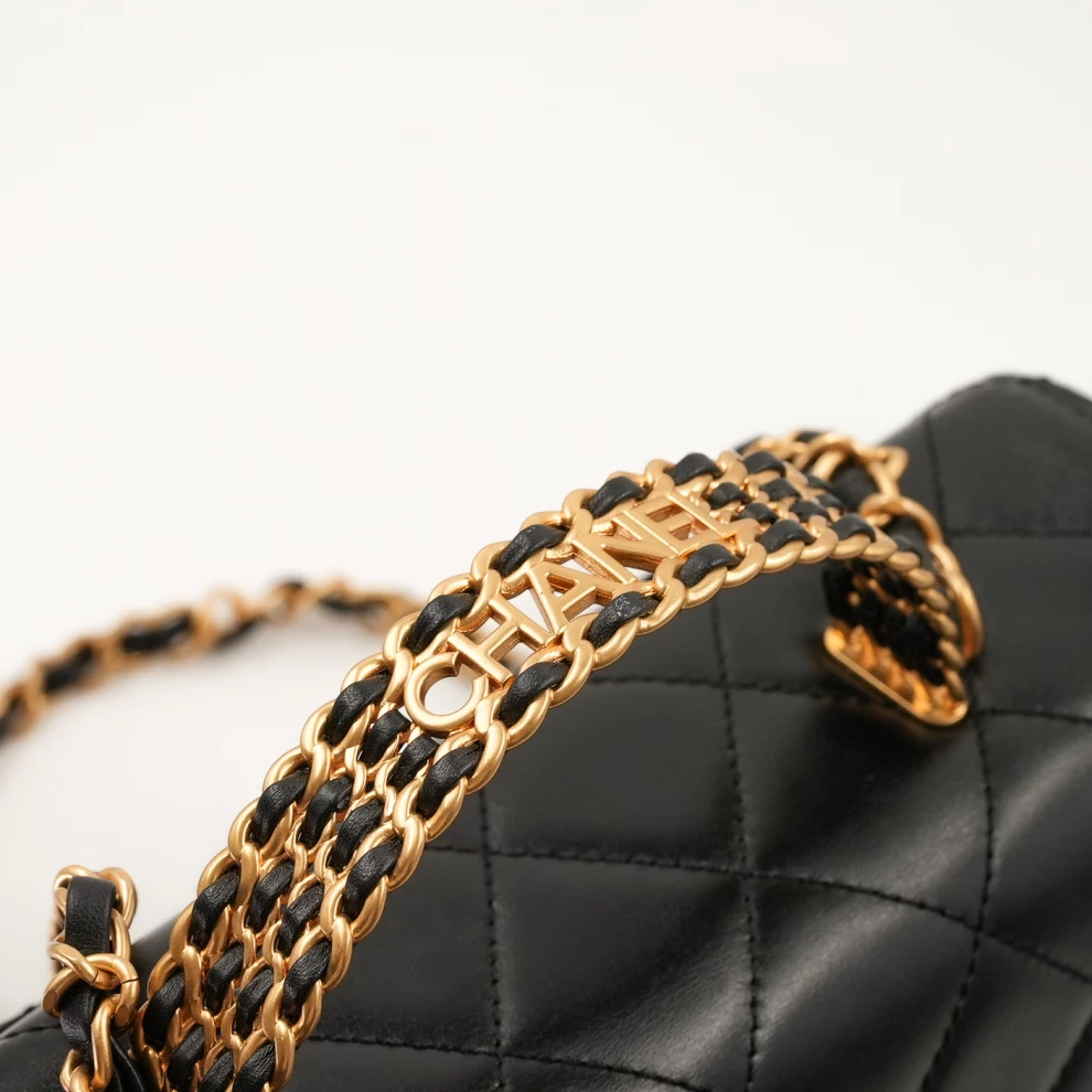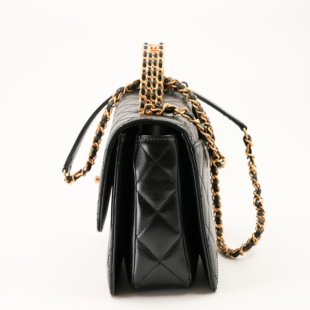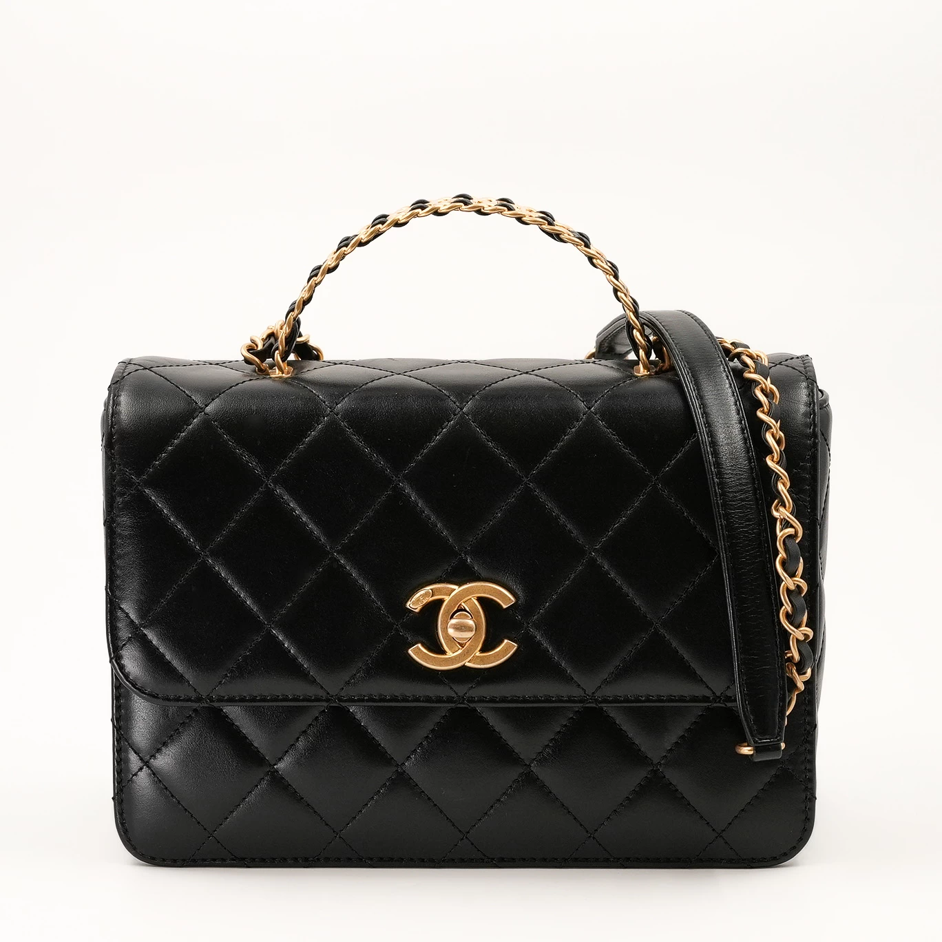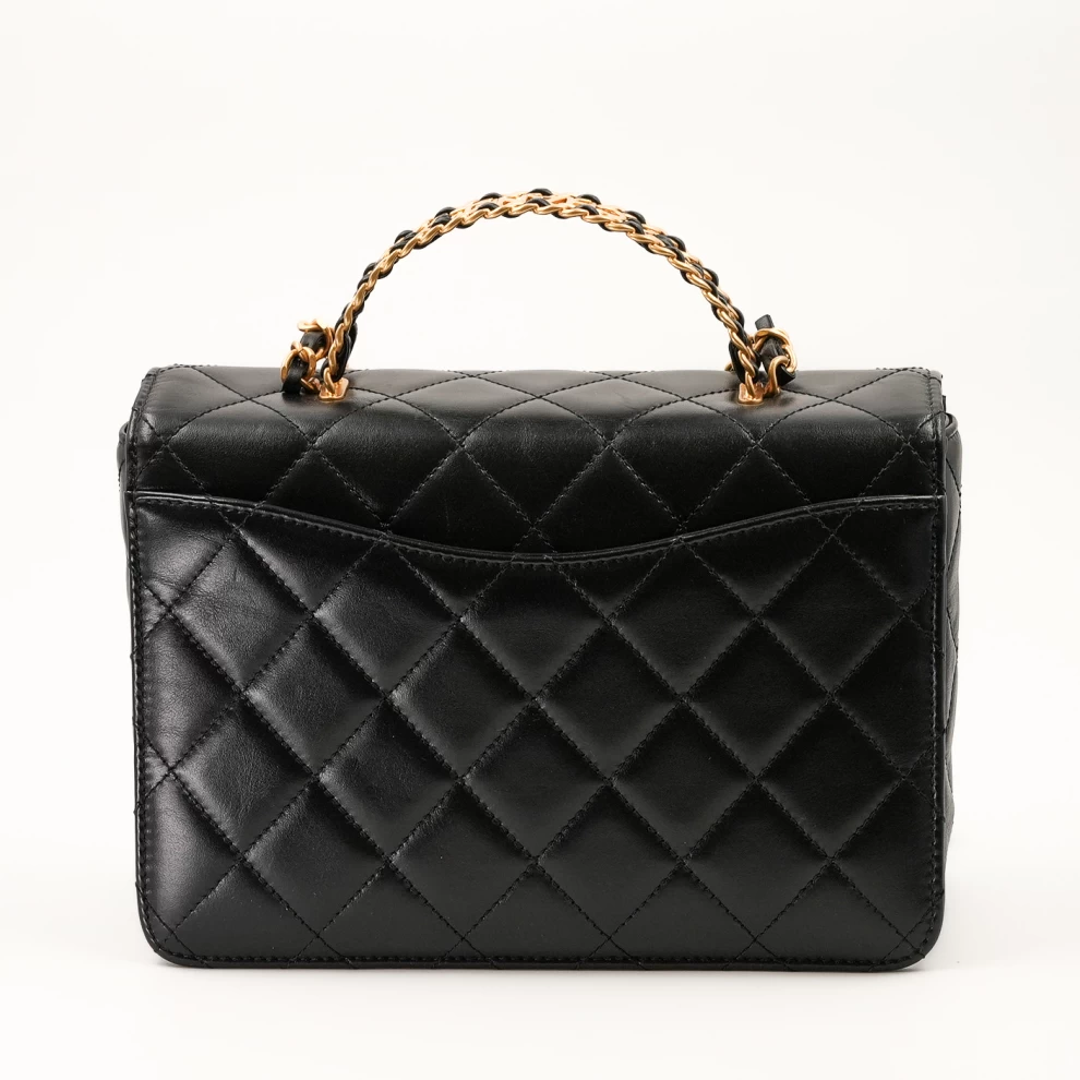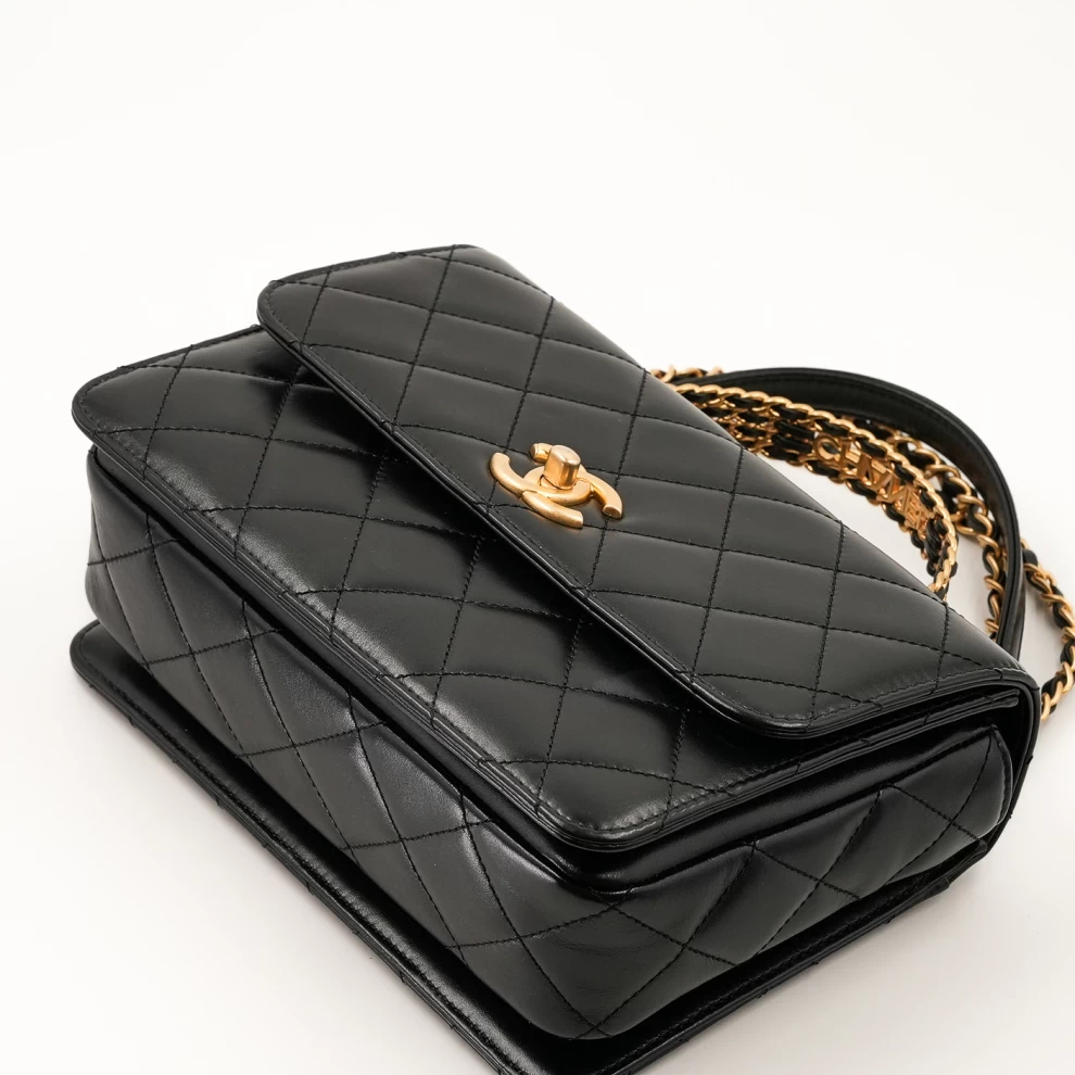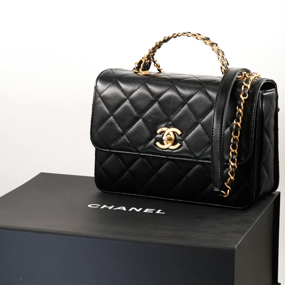 This pre-owned Chanel Business Affinity offers a modern twist on classic house codes. Crafted from durable quilted leather in sleek black, it features a unique braided chain top handle and a practical crossbody strap. The signature CC turn-lock opens to a spacious interior designed for organization. Known for its structured, boxy silhouette and elegant gold-tone hardware, this versatile piece transitions seamlessly from professional settings to evening events with effortless style.