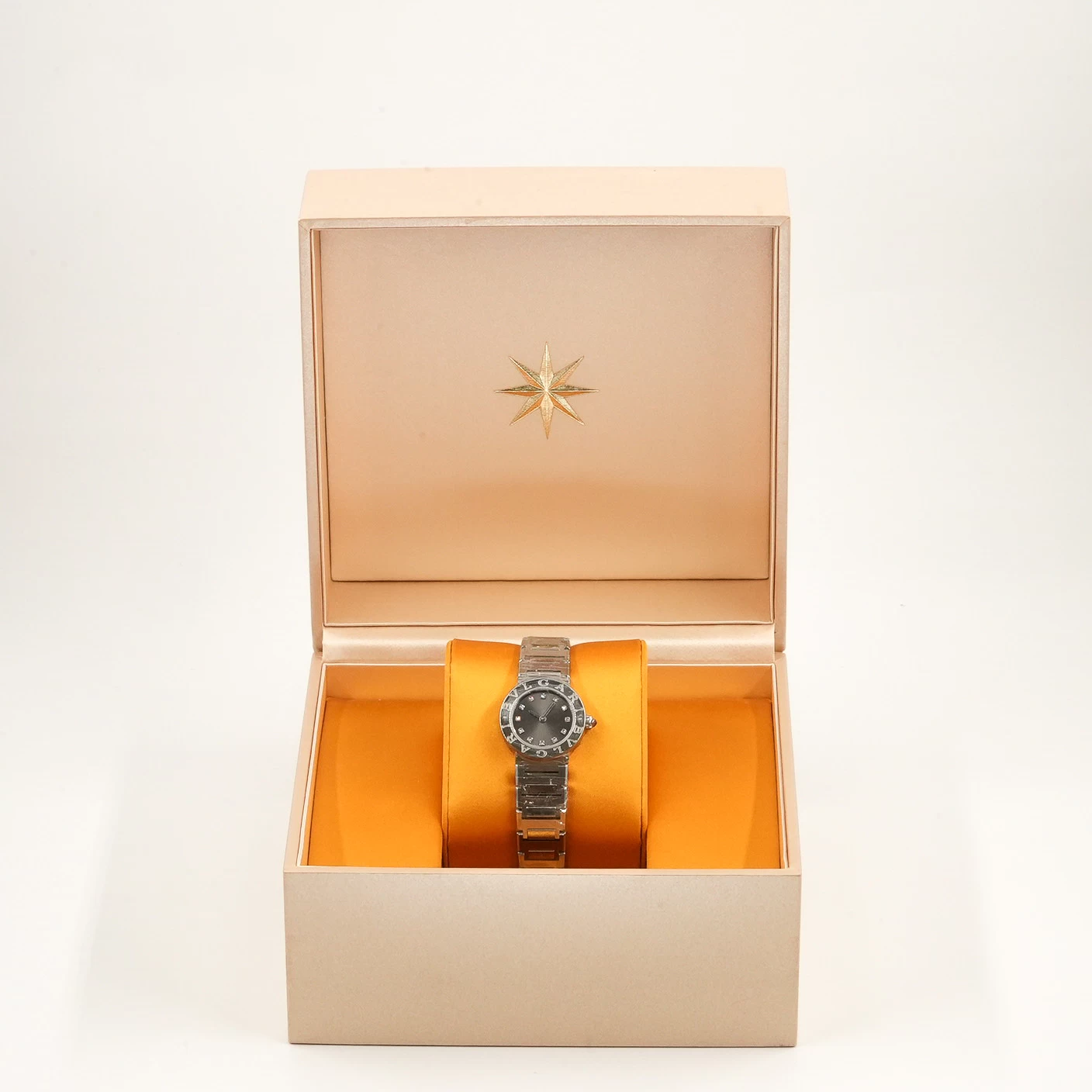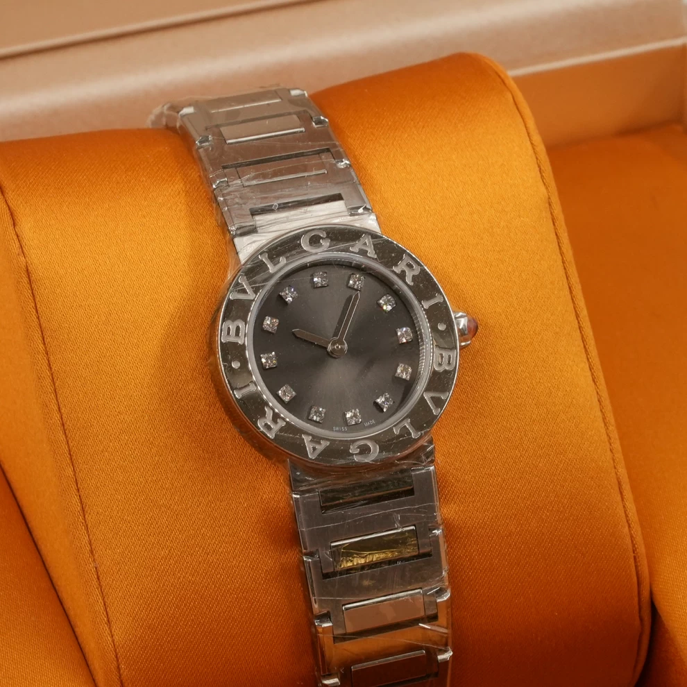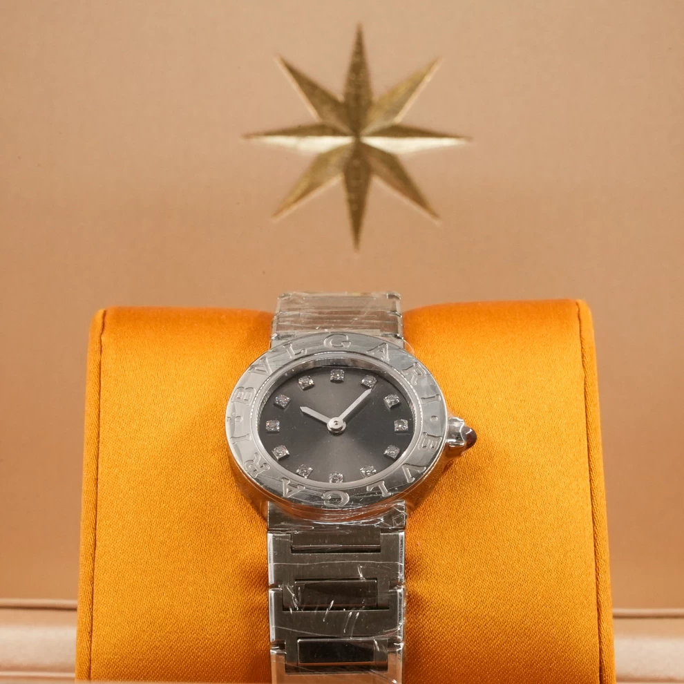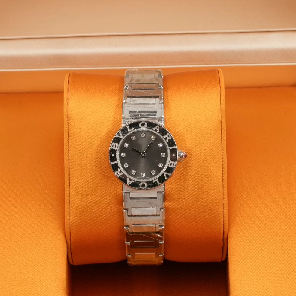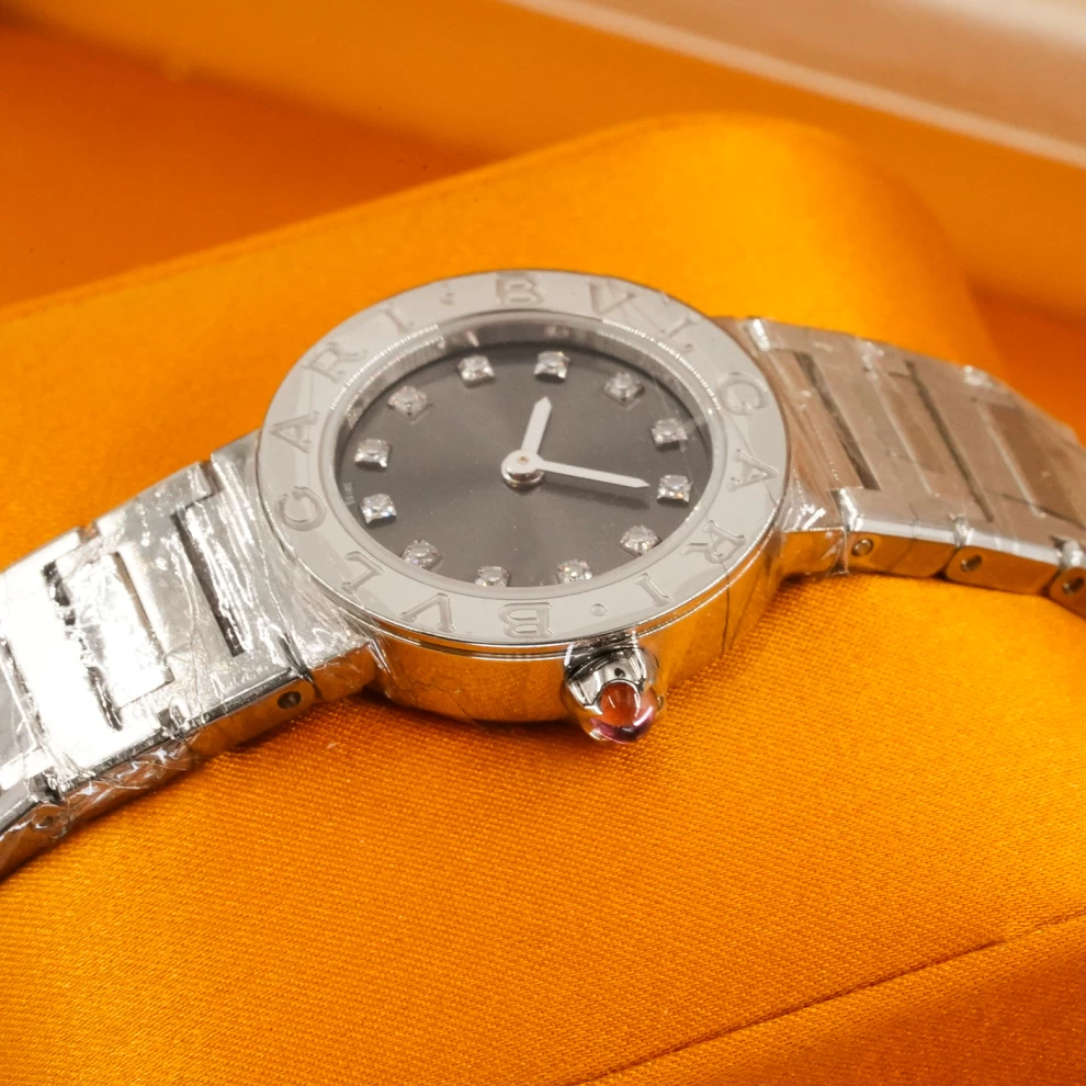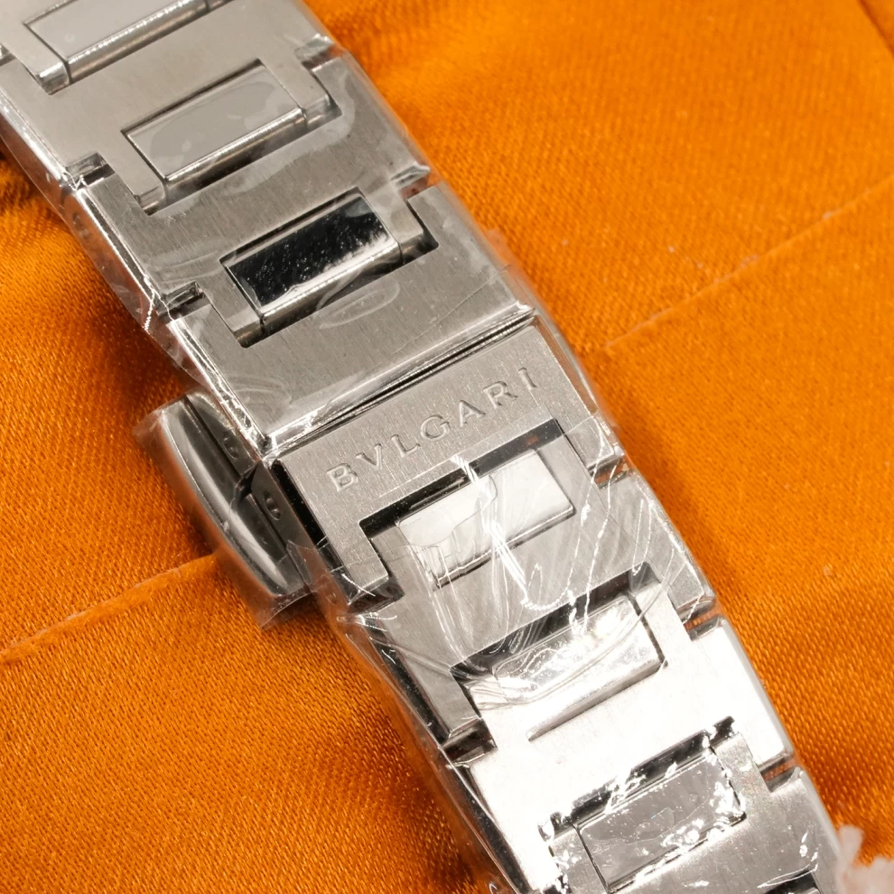 This pre-owned Bulgari Bulgari watch is a masterclass in Roman-inspired design. It features the iconic stainless steel bezel engraved with the brand's double logo, a motif inspired by ancient Roman coins. The elegant black dial is minimalist, punctuated by shimmering diamond hour markers for a touch of brilliance. Finished with a sleek, integrated stainless steel link bracelet, this timepiece offers a bold yet feminine aesthetic that transitions perfectly from day to night.